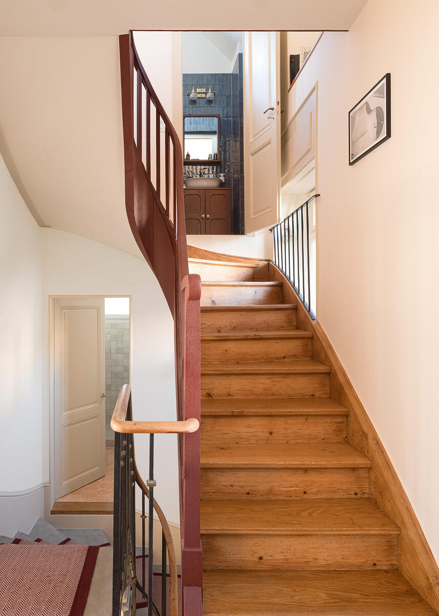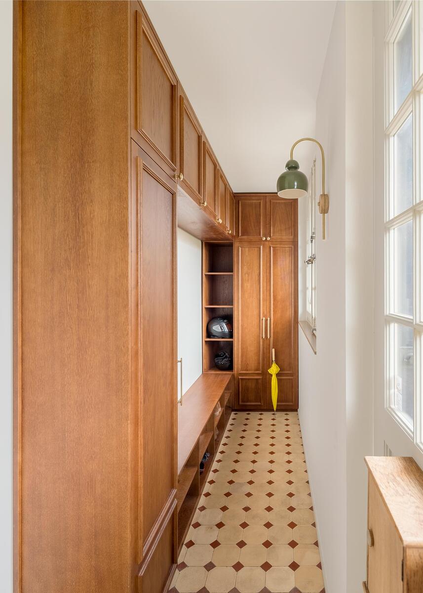 Afin de conserver au maximum le cachet de l’ancien, il est décidé de rénover les châssis des fenêtres existantes tout en changeant les vitrages afin d’en améliorer les performances thermiques. Toutes les menuiseries existantes (portes, armoires etc.) sont poncées et repeintes.